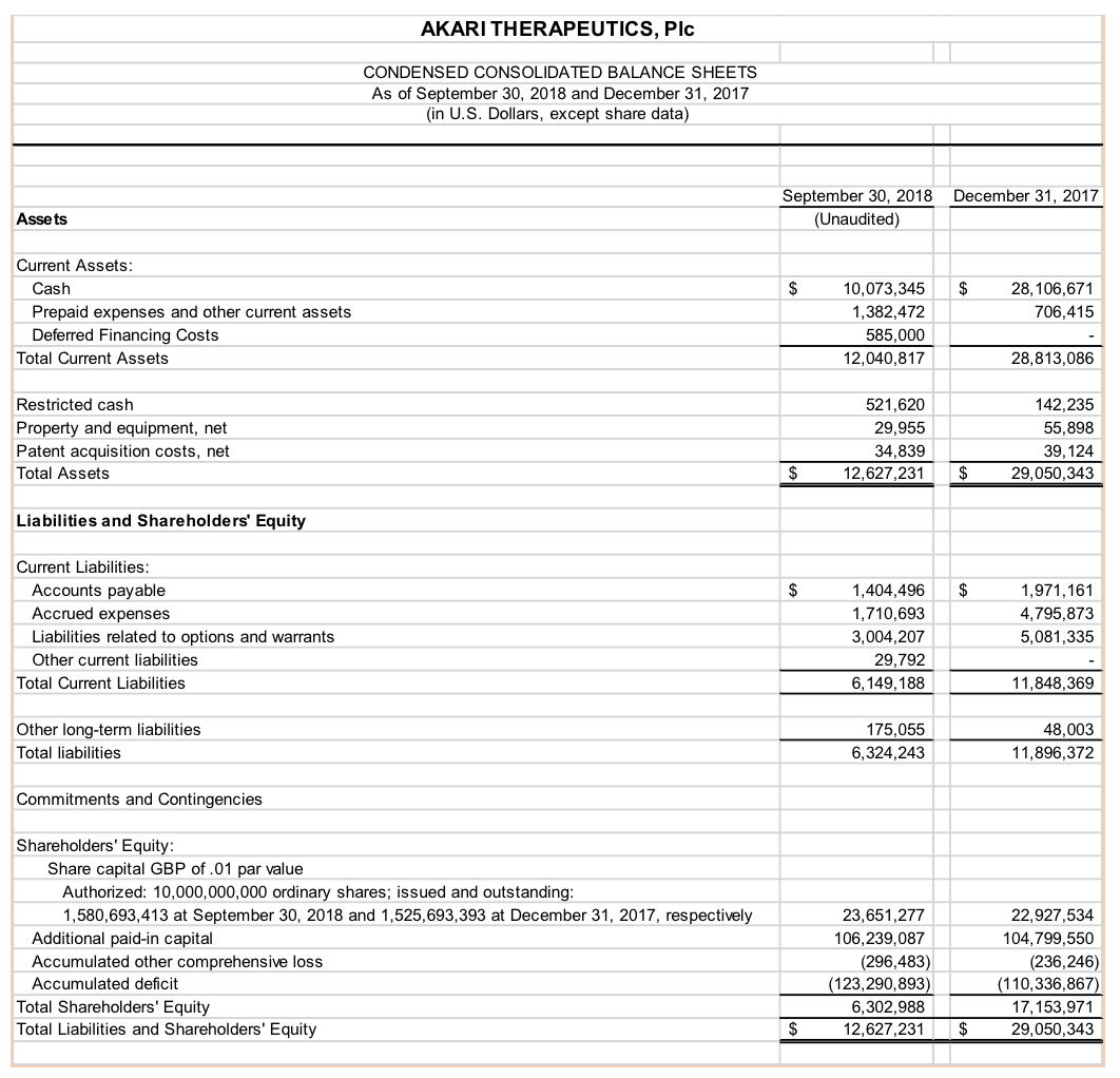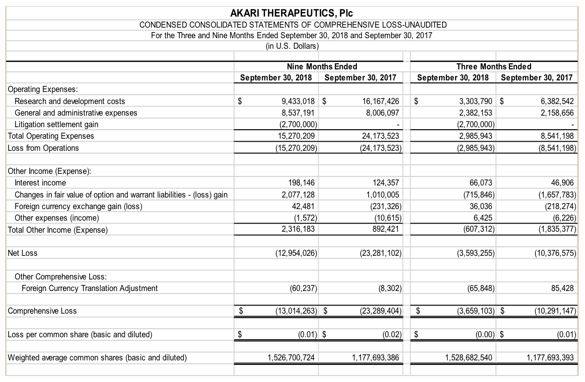 NEW YORK and LONDON, November 15, 2018 – Akari Therapeutics, Plc (NASDAQ:AKTX), a biopharmaceutical company focused on innovative therapeutics to treat orphan autoimmune and inflammatory diseases where complement and or leukotriene systems are implicated, today announced its financial results for the third quarter ended September 30, 2018.