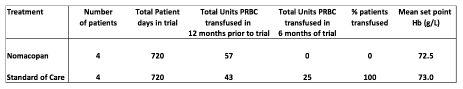 The interim data tabulated below shows that the four patients on nomacopan met the primary endpoint and received no transfusions for the first six months of treatment while all four patients on placebo were transfused during the first six months of treatment. Both groups had similar historic transfusion levels and mean Hb set points. The difference is statistically significant at the p=0.034 level.