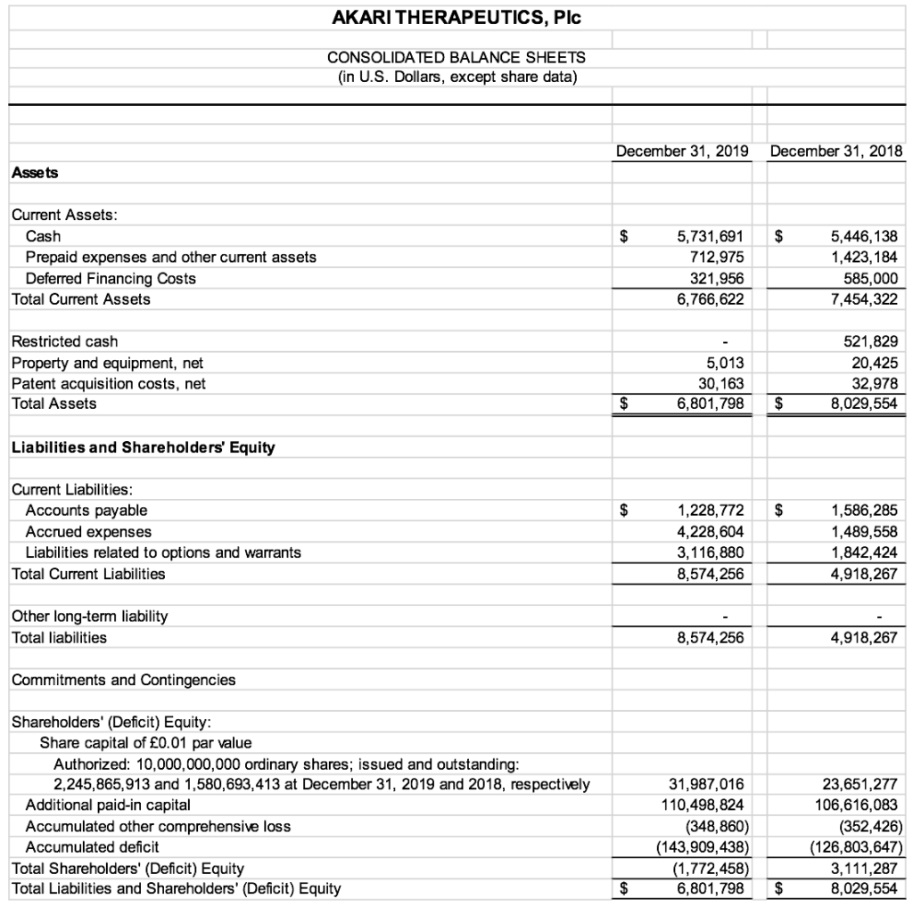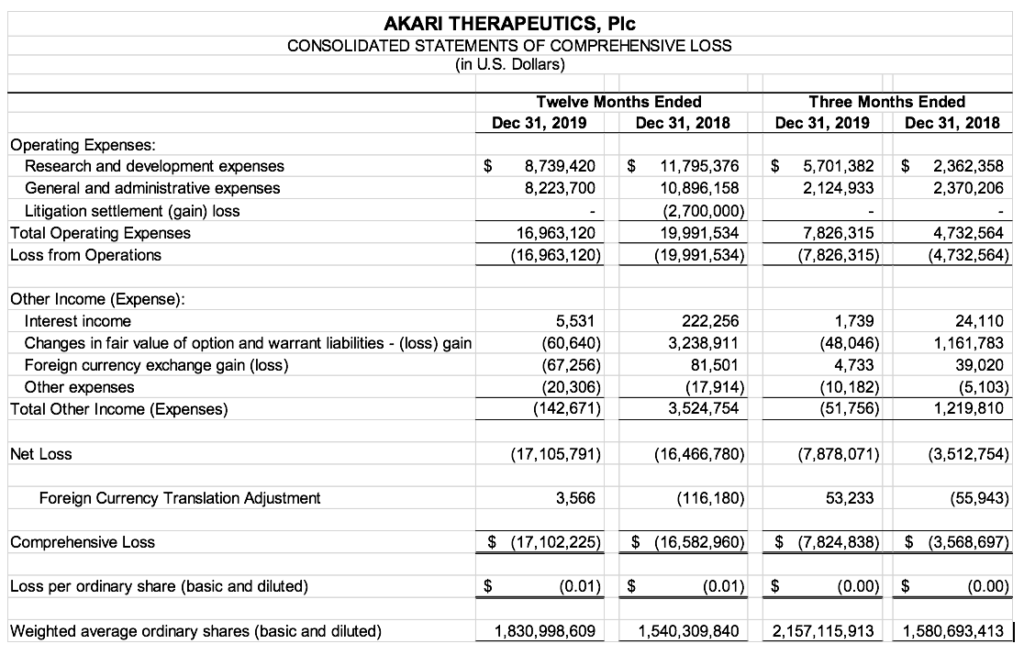 NEW YORK and LONDON, March 31, 2020 – Akari Therapeutics, Plc (Nasdaq: AKTX), a biopharmaceutical company focused on innovative therapeutics to treat orphan autoimmune and inflammatory diseases where complement (C5) and/or leukotriene (LTB4) systems are implicated, today announced financial results for the fourth quarter and full year ended December 31, 2019, as well as recent business highlights.