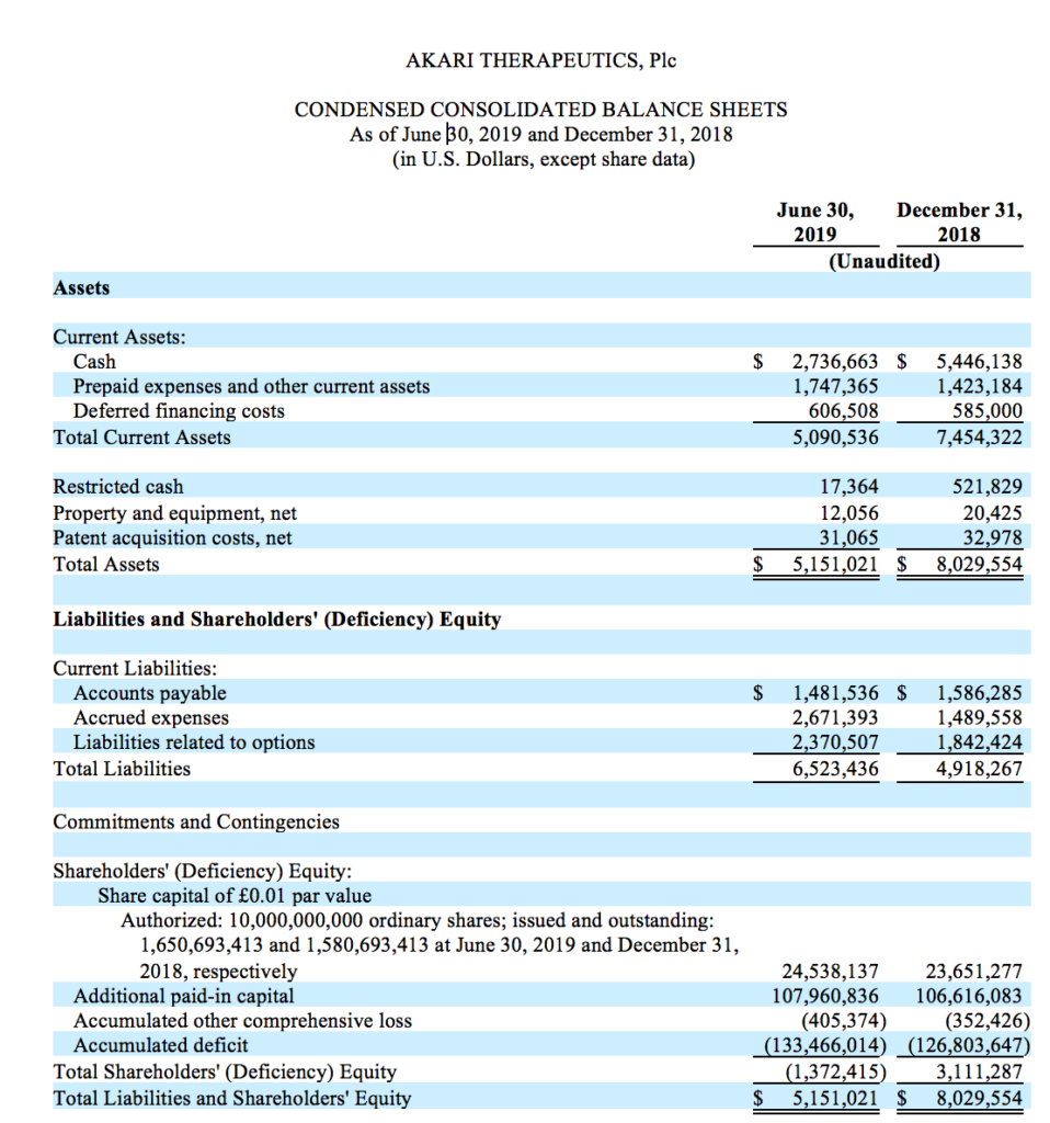 - As of June 30, 2019, the Company had cash of $2.7 million, as compared to cash of $5.4 million as of December 31, 2018. On July 3, 2019, the Company sold to certain institutional investors, accredited investors and an existing shareholder, RPC Pharma Ltd., an affiliated entity of Dr. Ray Prudo, Akari’s Chairman, an aggregate 2,368,392 registered American Depository Shares (ADSs) of Akari at a purchase price of $1.90 per ADS, resulting in gross proceeds of approximately $4.5 million. Additionally, for each ADS purchased by investors, the investors received an unregistered warrant to purchase one-half ADS. The warrants have an exercise price of $3.00 per ADS, were exercisable upon their issuance and will expire five years from the issuance date.