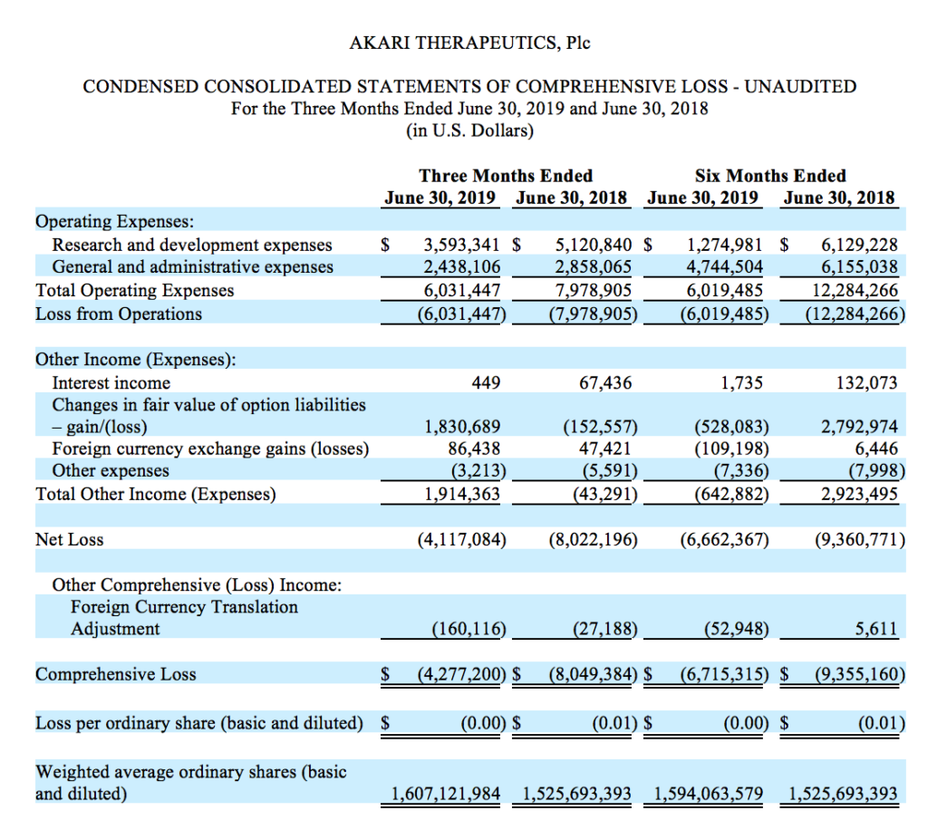 NEW YORK and LONDON, August 29, 2019 – Akari Therapeutics, Plc (Nasdaq: AKTX), a biopharmaceutical company focused on innovative therapeutics to treat orphan autoimmune and inflammatory diseases where complement (C5) and/or leukotriene (LTB4) systems are implicated, today announced financial results for the second quarter ended June 30, 2019 and recent clinical progress.